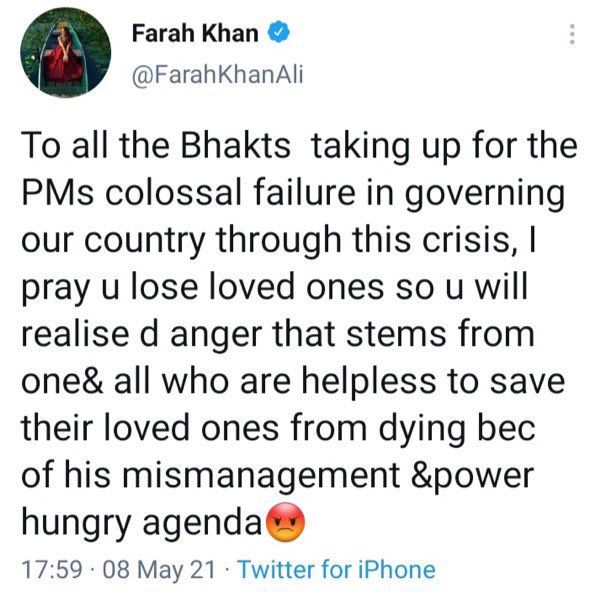 In a tweet, she said that all the ‘Bhakts’ who are ‘taking up’ for the ‘PM’s colossal failure’ in the current Chinese coronavirus pandemic, ‘I pray you lose loved ones’. She prayed that the ‘Bhakts’ lose their loved ones so they ‘realise’ the anger which stems from those who are not able to do anything to save their dying loved ones. She attributed the deaths to PM Modi’s ‘mismanagement and power hungry agenda’.