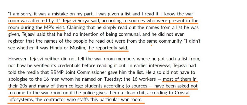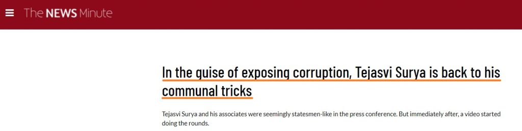 The News Minute, a news website that claims to report facts, gave a communal twist to the entire incident by not only sidestepping on the issue of massive irregularities in the process but also perhaps to hide the Congress links to the bed-allocation scam that was unearthed by the BJP MP. Following that, a series of media reports emerged that Tejasvi Surya had deliberately uttered the names of the employees working in the BBMP war room as they had belonged to the Muslim community.