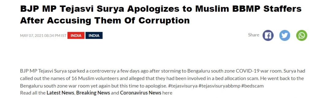 Another news website News18 added that BJP MP Tejasvi Surya apologises to Muslim BBMP staffers accusing them of corruption. However, in the entire report, they have failed to put out facts or evidence to back their claims.