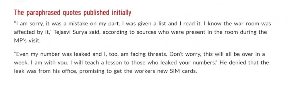 In the edited report, TNM rephrased some of the earlier invented quotes that were published by them earlier to depict that Tejasvi Surya had not only apologised for his actions but also sought vengeance for leaking his personal details.