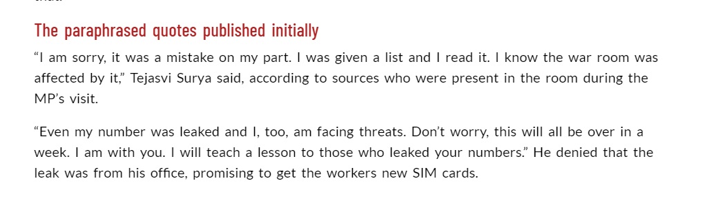 Tejasvi told the war room that his number too was leaked, even his parents are being abused. All sides need to stop this. Focus on the pandemic. We will update copy with all the quotes. After that, no more tweets from me on this. I got other work to do.