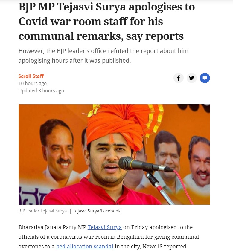 Another far-left website – Scroll, which has a history of peddling misinformation on social media, went a step ahead to declare that BJP MP Tejasvi Surya apologised to Covid war room staff for his alleged ‘communal’ remarks.