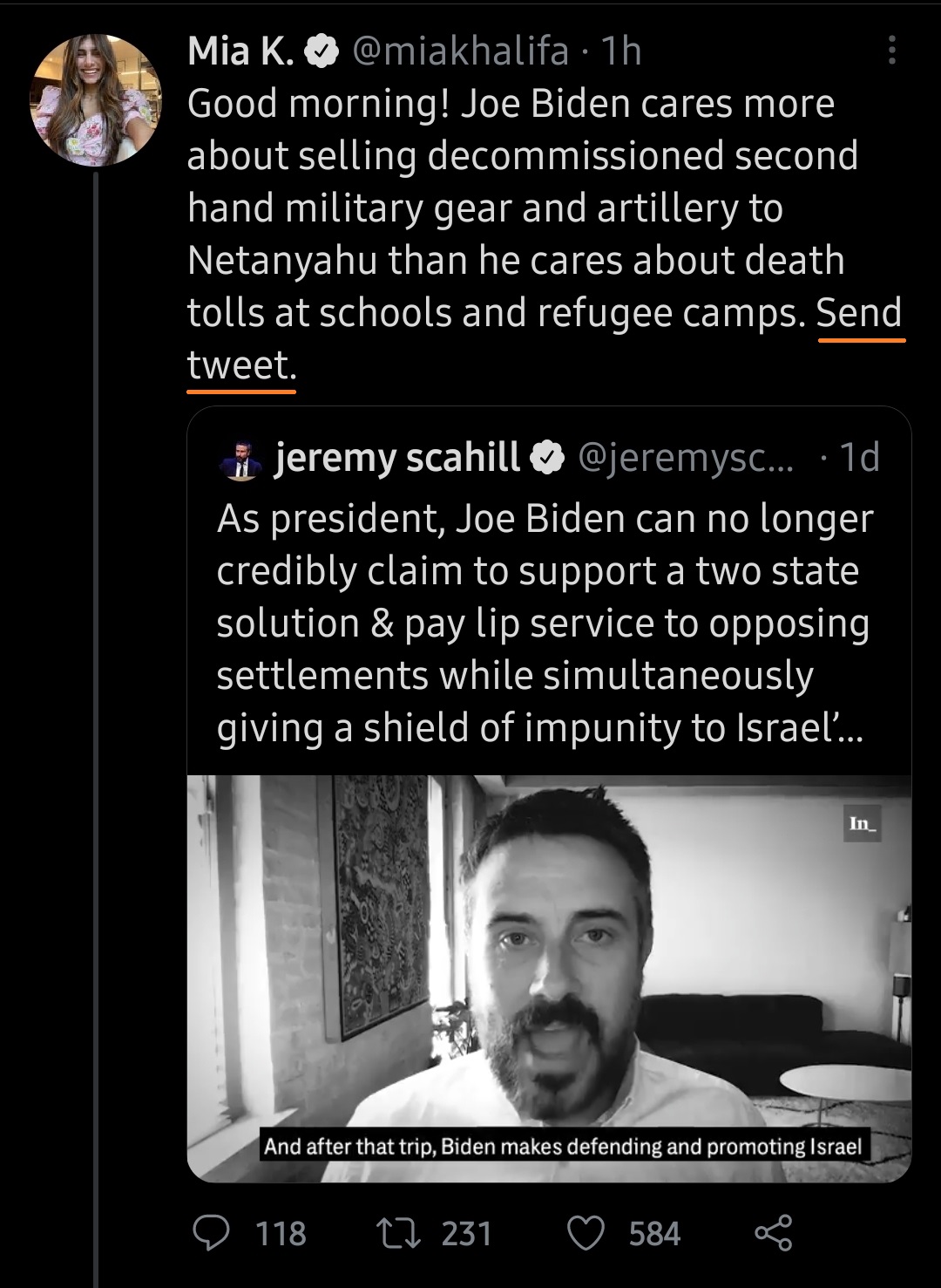 Mia Khalifa said that she thought the phrase “send tweet“ meant “that’s the tweet”, which according to her, was a colloquial-internet slang for “full stop”.