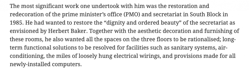 Kohli had reportedly worked with Rajiv Gandhi on a host of projects—the redecorations of prime minister’s secretariat in South Block; the prime minister’s office and cabinet meeting room in Parliament House, Rashtrapati Bhavan, Hyderabad House, Panchsheel Bhawan, Jawahar Bhawan and two official Boeing aircraft. However, the beautification of the Prime Minister’ Secretariat grabs the spotlight, since it was carried out just months after Rajiv Gandhi became the Prime Minister and in the wake of the Bhopal Gas Tragedy.