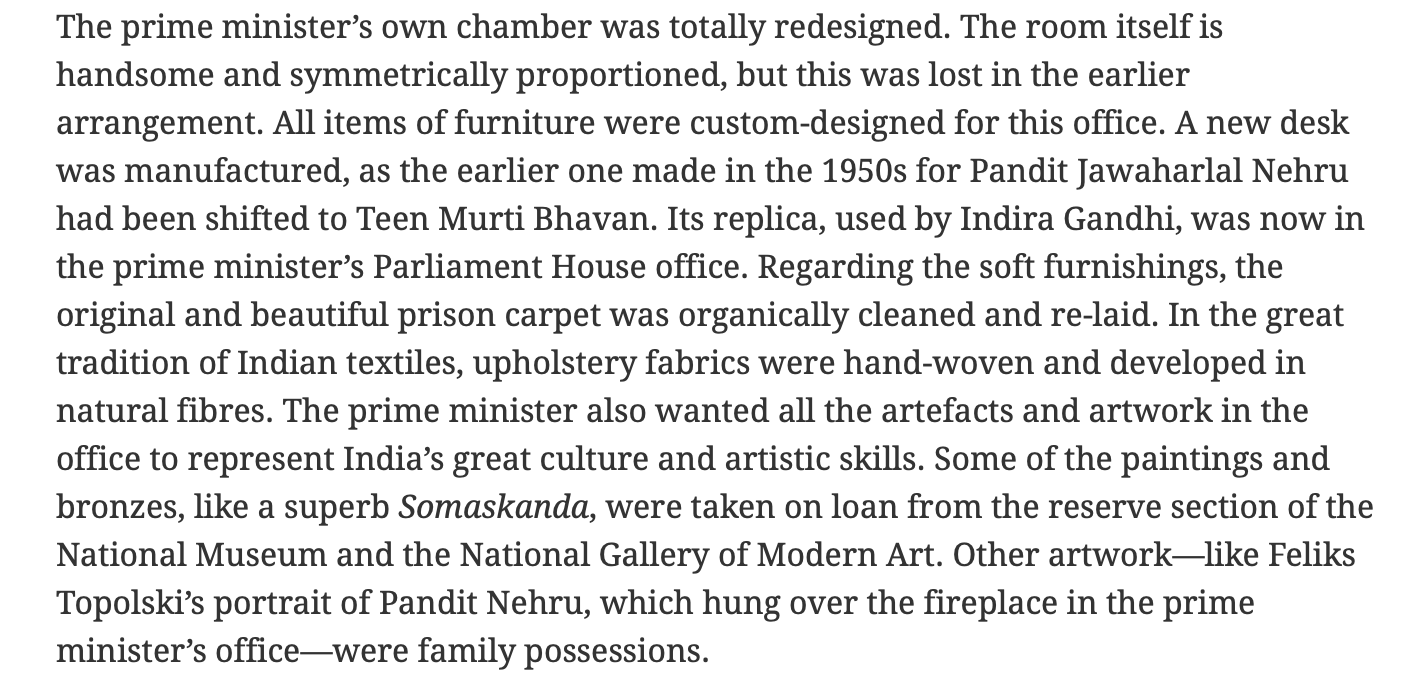 Speaking on the design changes brought in the office of the PMO, Kohli says in the article, “The prime minister’s own chamber was totally redesigned. The room itself is handsome and symmetrically proportioned, but this was lost in the earlier arrangement. All items of furniture were custom-designed for this office. A new desk was manufactured, like the earlier one made in the 1950s for Pandit Jawaharlal Nehru had been shifted to Teen Murti Bhavan. Its replica, used by Indira Gandhi, was now in the prime minister’s Parliament House office.”