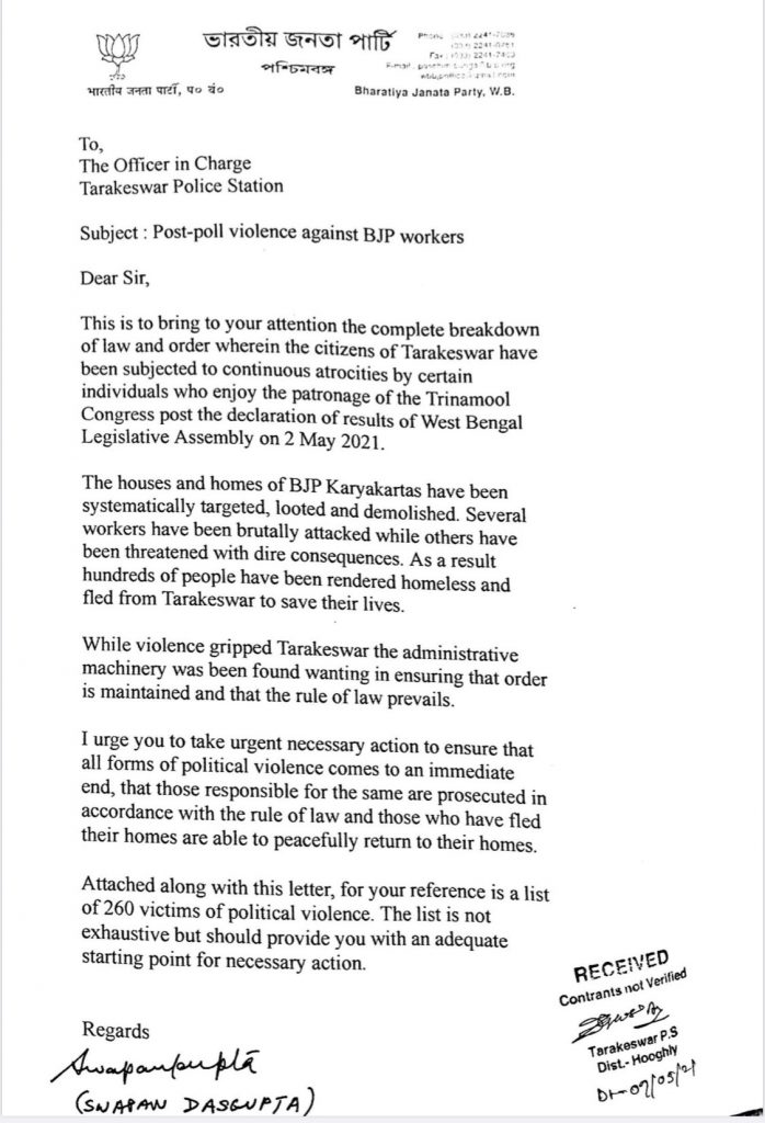 Went to Tarakeshwar PS to register a formal complaint of the persecution of BJP workers. I included a list of 260 victims of the political violence (including those who are unable to return home). I think it was important to put it on record. pic.twitter.com/BqzcUdKkI8