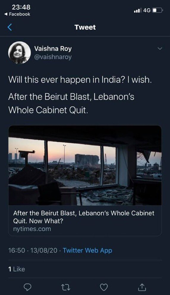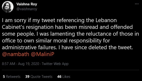 As it turns out, Vaishna Roy has a proven track record of airing morbid opinions on the internet. After the Beirut Blast in Lebanon last year, she wished for something of a similar sort to happen in India.