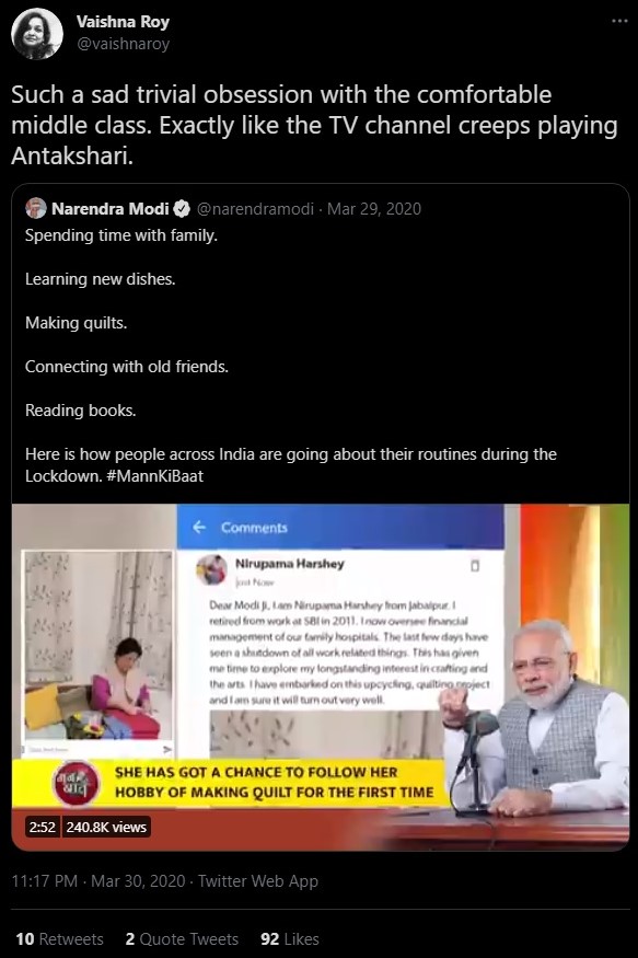 Vaishna Roy also opined that Narendra Modi had a “sad trivial obsession with the comfortable middle class”. Like her liberal counterparts, she is clearly not fond of the middle class.