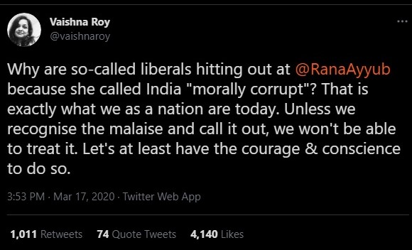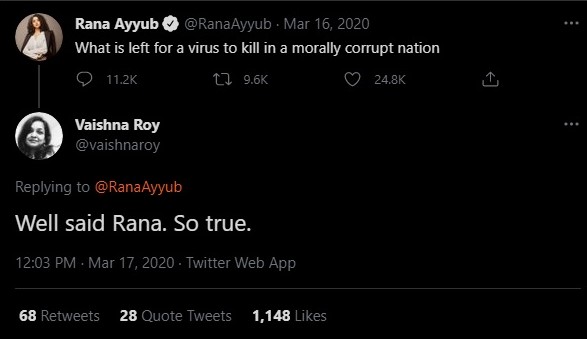 Roy had also wholeheartedly agreed to Rana Ayyub when the latter made her “What is left for a virus to kill in a morally corrupt nation” comment.