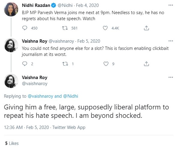 Vaishna Roy had also called former NDTV journalist Nidhi Razdan a ‘fascism enabler’ for inviting a BJP MP to her show. She said she was “beyond shocked”.