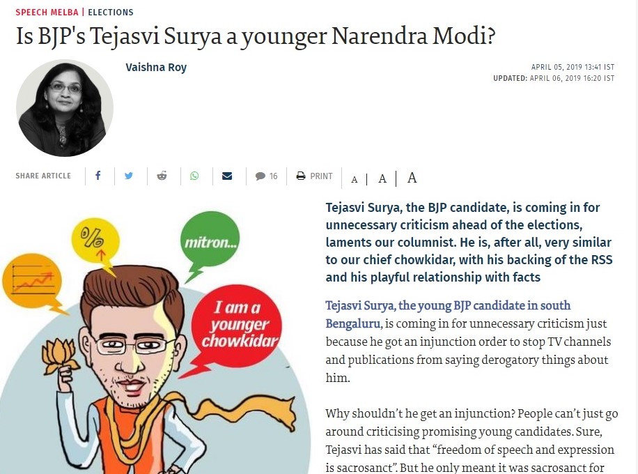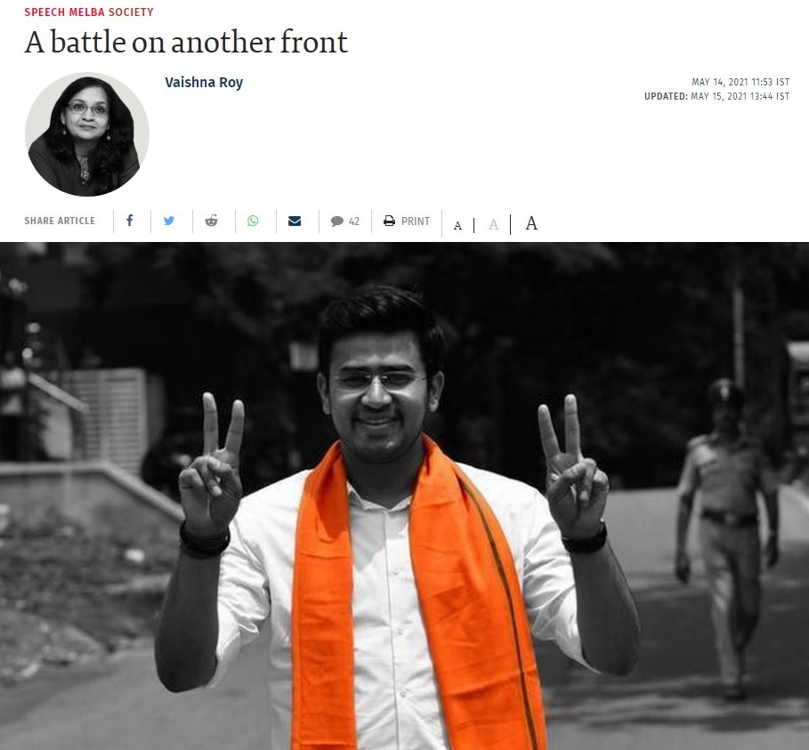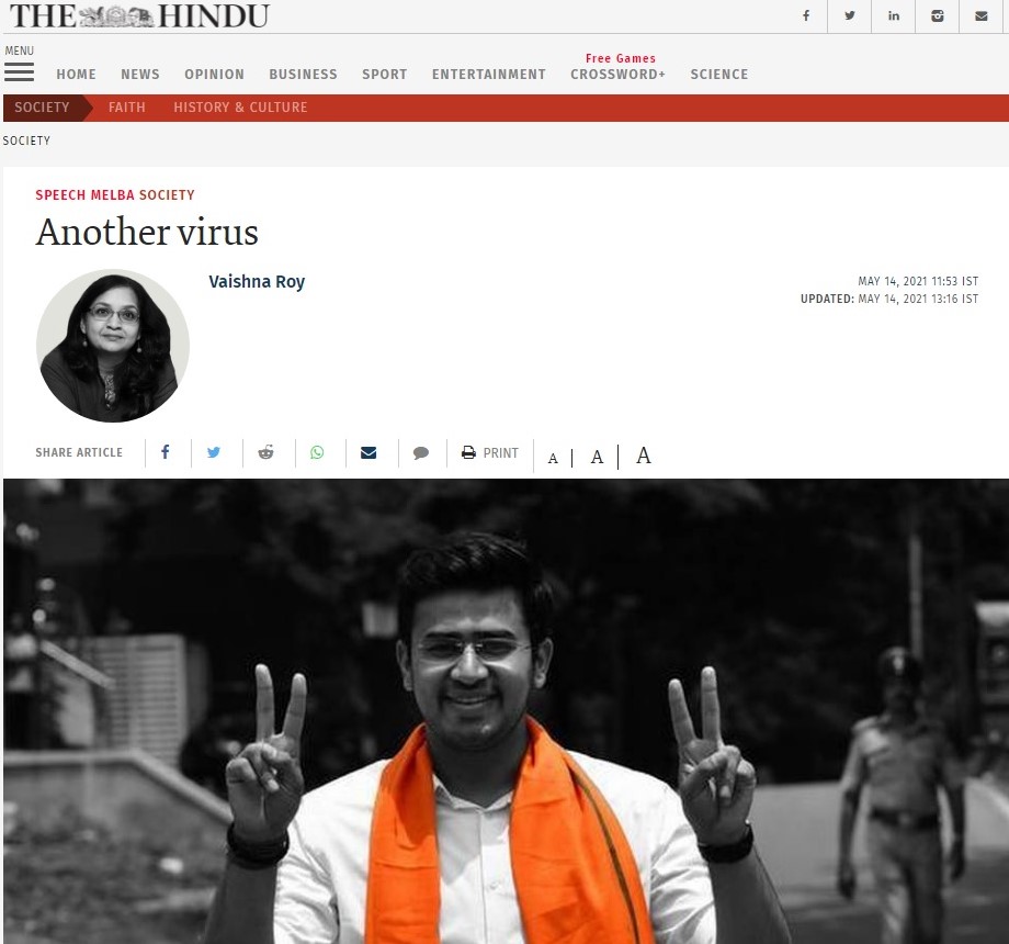 The Hindu published an opinion-editorial on Friday where it called BJP MP Tejasvi Surya a virus. The article, authored by one Vaishna Roy, was littered with the usual bile that has come to dominate the pages of the mainstream media.
