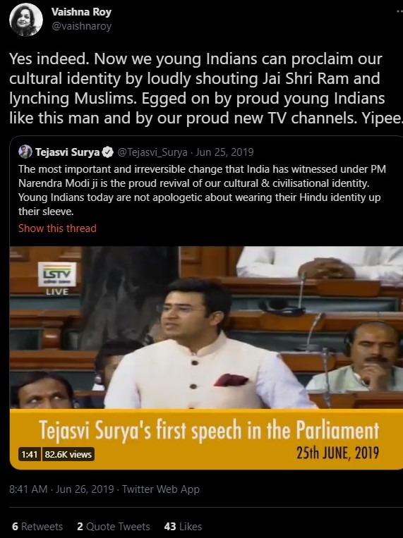 On a separate occasion, Roy had quote tweeted a tweet by Tejasvi Surya and said, “Now we young Indians can proclaim our cultural identity by loudly shouting Jai Shri Ram and lynching Muslims. Egged on by proud young Indians like this man and by our proud new TV channels.”