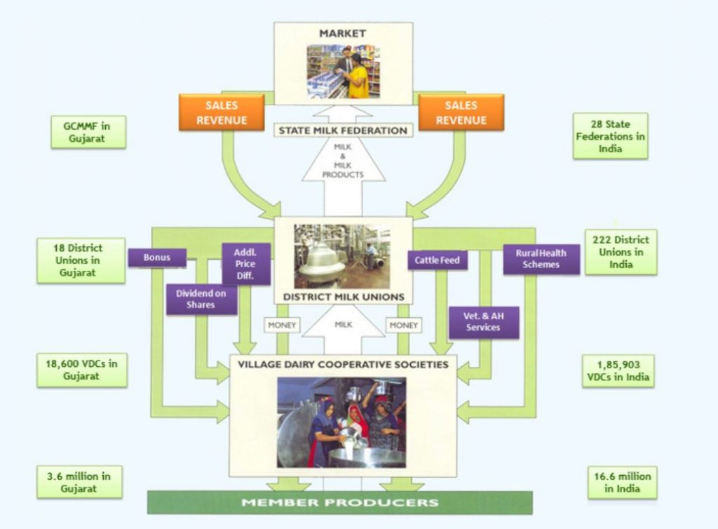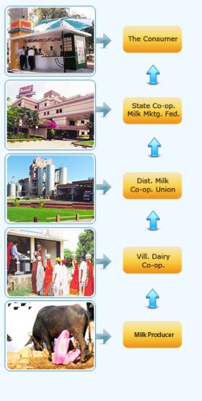 The Amul Model of dairy development is a three-tiered structure with the dairy cooperative societies at the village level federated under a milk union at the district level and a federation of member unions at the state level.