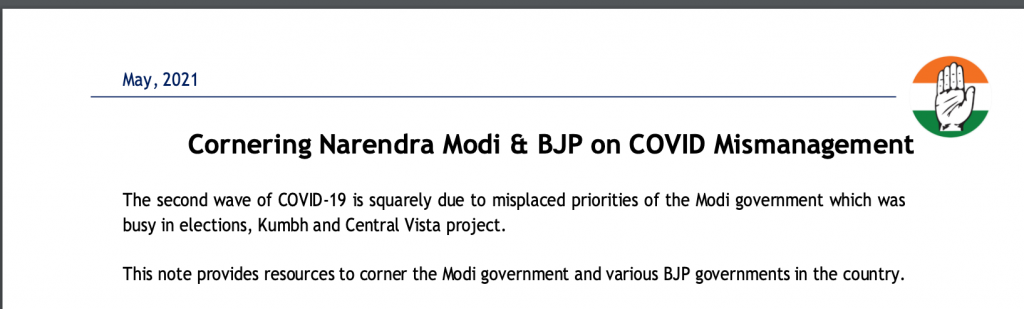 On Tuesday, two documents were ‘leaked’ on social media which gave point to point notes on how to question and discredit the Modi government on a few key points. The documents were allegedly created by the AICC research development. While Congress had refuted the documents as fake, there were some uncanny similarities between the instructions in the toolkit and how the narrative especially around the pandemic was built.