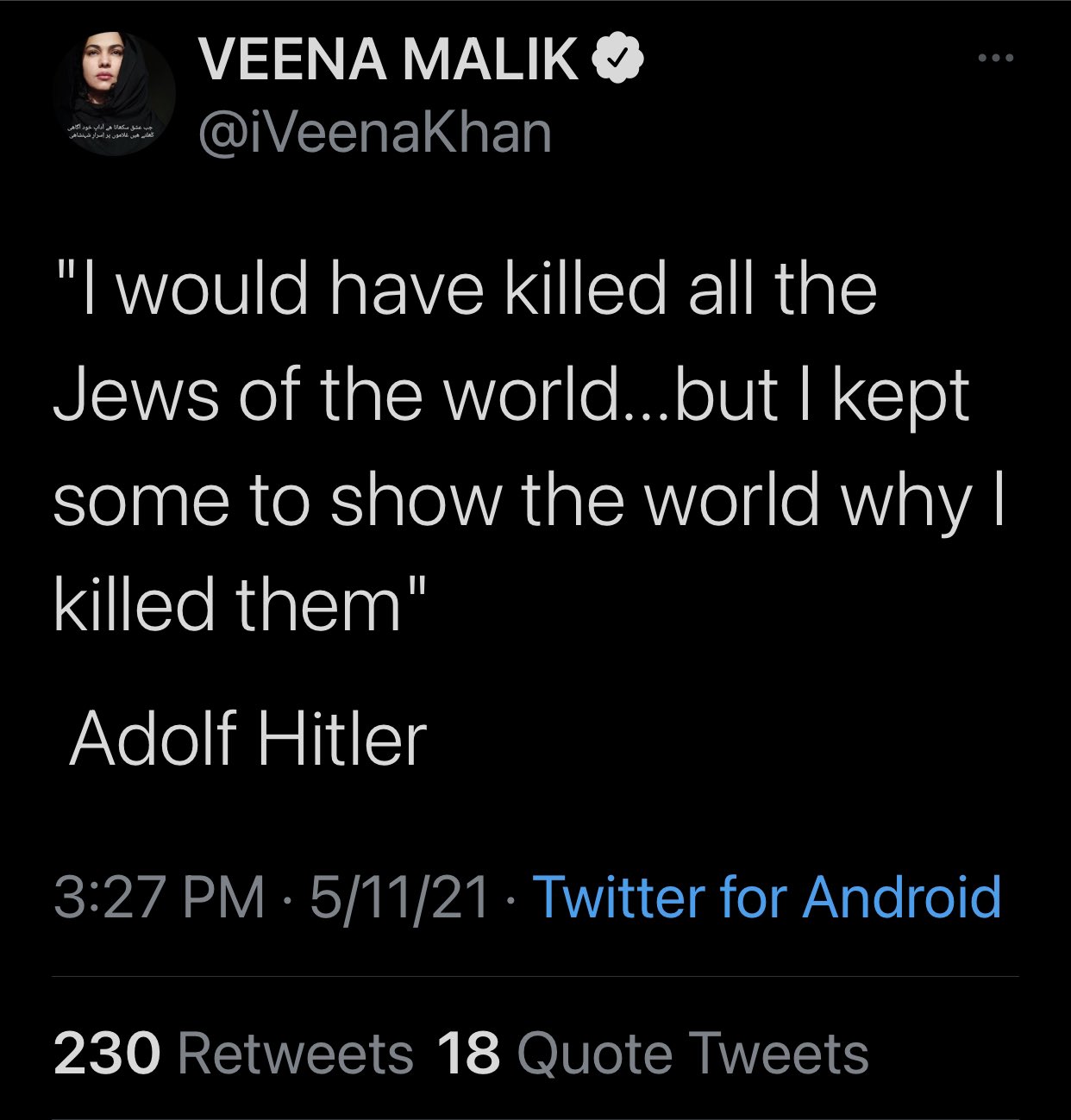 Pakistani actress Veena Malik on Tuesday misattributed a quote to German dictator Adolf Hitler glorifying genocide of Jews as the Israel-Palestine conflict broke out on Friday.