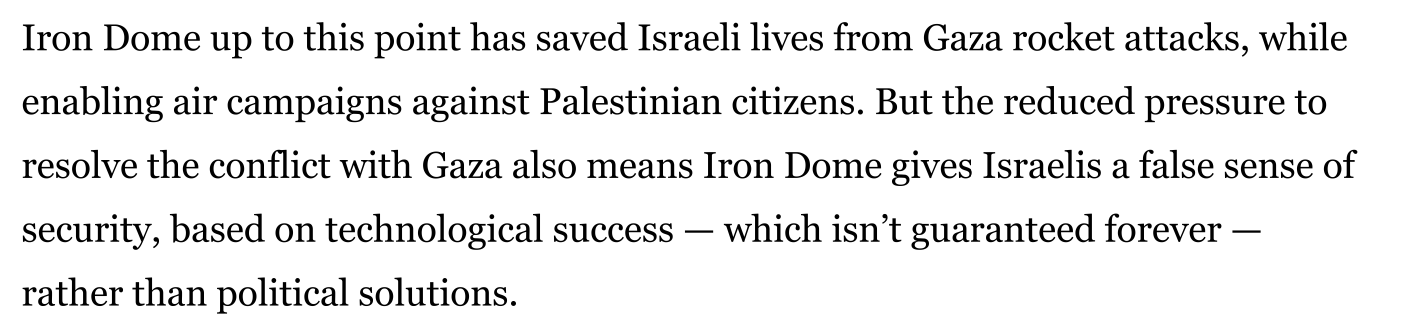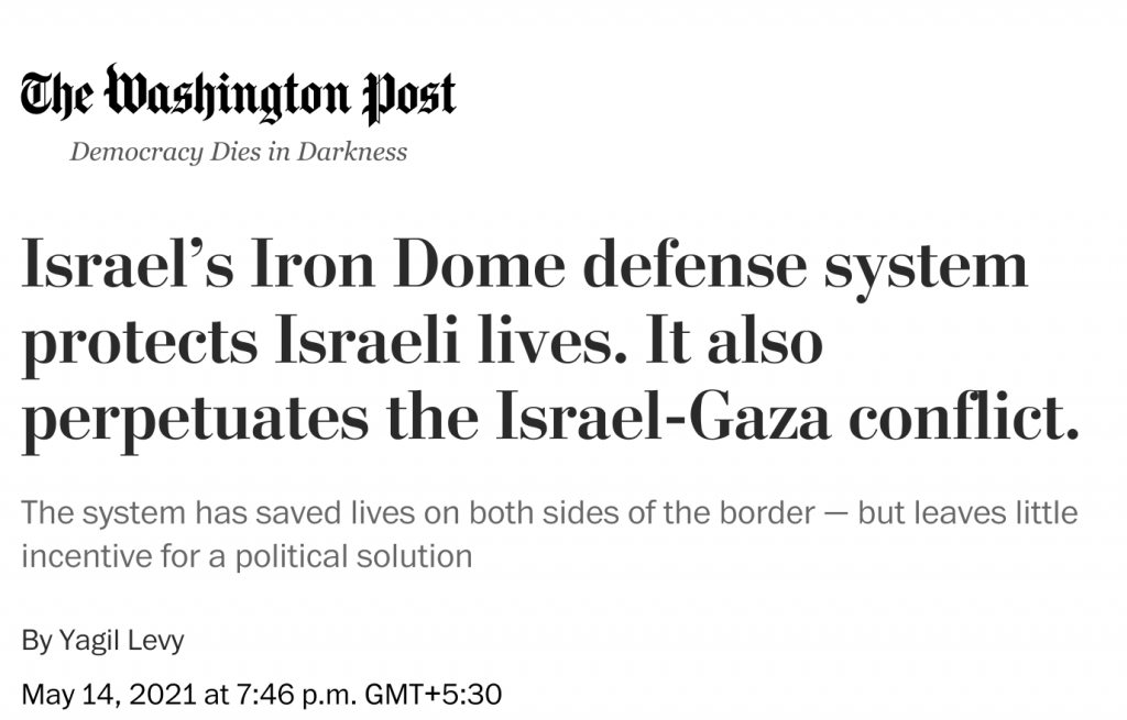 Further, WaPo claims that since Israel has Iron Dome, it has ‘false sense of security based on technological success’ which ‘isn’t guaranteed forever’.