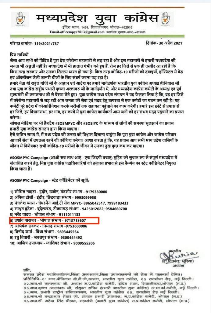 Ironically, Parashar was elected as the City coordinator of Bhopal by the Madhya Pradesh Youth Congress for overlooking the SOS alerts emanating from the state in the wake of the resurgent coronavirus outbreak. According to the police, Prashant Parashar was a part of a nexus involved in the rampant distribution of fake Remdesivir injections in Madhya Pradesh.