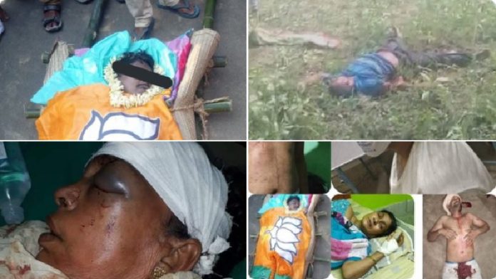 In another incident, an eighty-year-old lady namely Sova Rani Mondal, mother of Jagaddal BJP worker Kamal Mondal, was killed while trying to save her son from the bloodthirsty TMC cadres. In what transpired, the TMC goons were beating up Kamal Mandal and his wife for being affiliated to the BJP when his mother intervened to save her son. She was injured in the ensuing scuffle and later succumbed to her injuries.