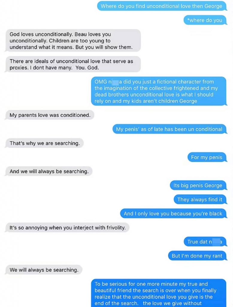 “OMG n—a,” Hunter responded before adding, “did you just a fictional character from the imagination of the collective frightened and my dead brothers unconditional love is what I should rely on and my kids aren’t children George.”