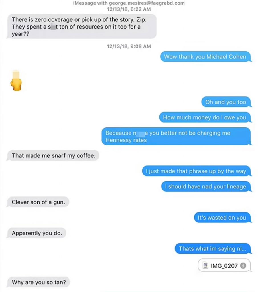 In the text exchanges with his attorney George Mesires, which also included lewd sexual talk, Hunter Biden asked the Chicago-based corporate lawyer, “How much money do I owe you?” before adding, “Because [sic] “n—a” you better not be charging me Hennessy rates”