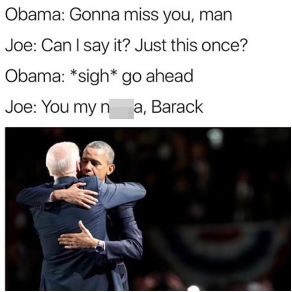 The meme’s text read, “Obama: Gonna miss you, man. Joe: Can I say it? Just this once? Obama: *sigh* go ahead. Joe: You my n***a, Barack”.