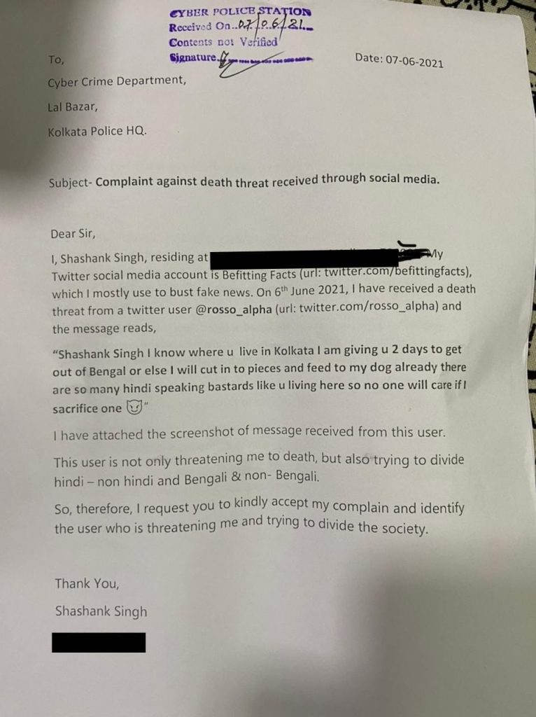Popular Twitter user Shashank Singh, whose account has the username BefittingFacts, received a death threat from an account with the username @rosso_alpha. The user called himself a ‘Bengali supremacist’. Singh has lodged a complaint with the Cyber Crime Department of the Kolkata Police in connection with the matter.