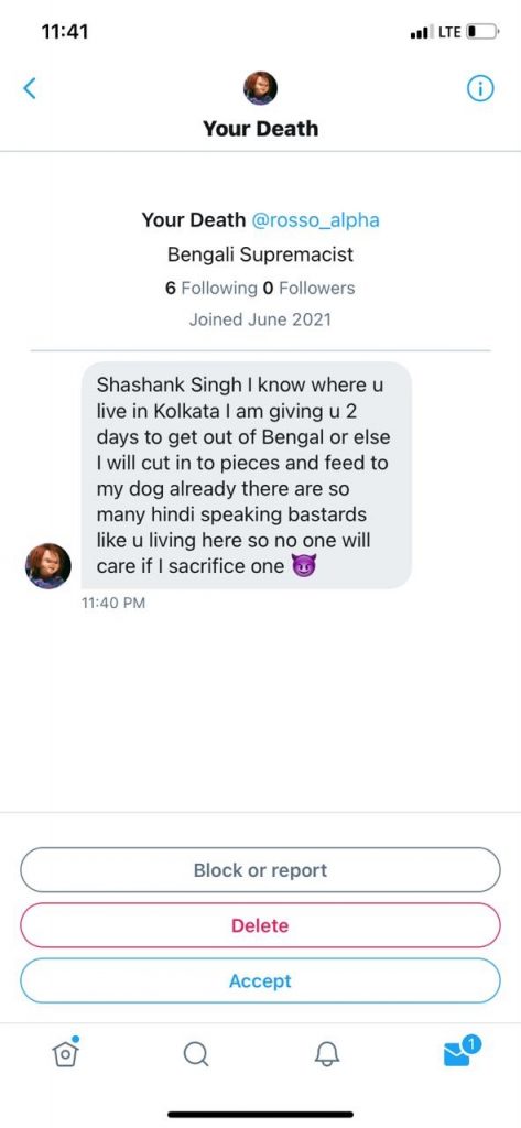 On the 6th of June, @rosso_alpha threatened Shashank Singh, “Shashank Singh I know where u live in Kolkata I am giving u 2 dats to get out of Bengal or else I will cut in to pieces and feed to my dog already there are so many hindi speaking b*st*rds like u living here so no one will care if I sacrifice one”. The user ended his threat with an emoji.