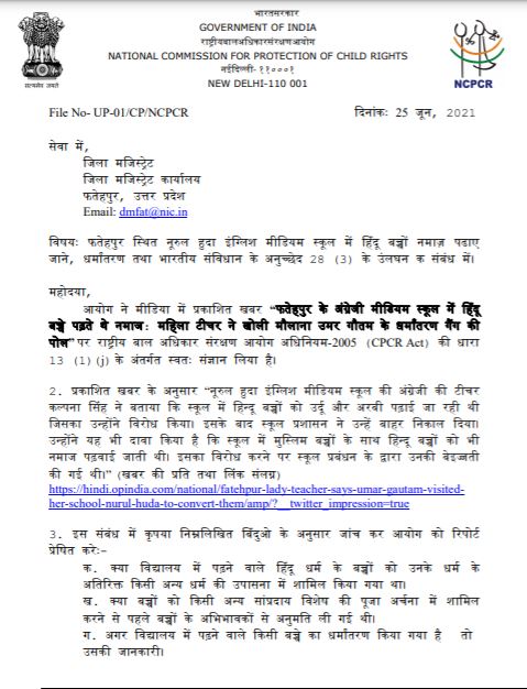 Sharing the link of the OpIndia report, NCPCR provided recommendations based on which the DM and SP of Fatehpur have been asked to carry out an enquiry and submit a report to the statutory body within three days.