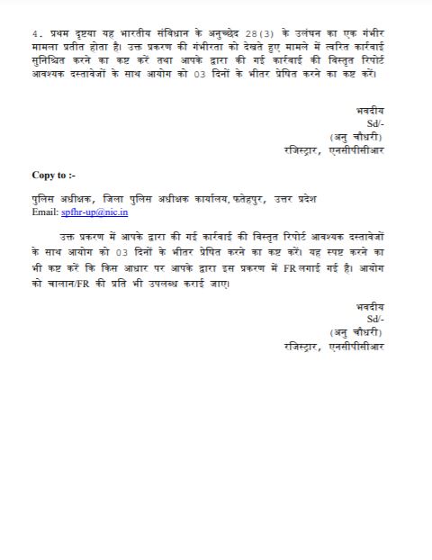 - Prima facie this case appears to be in serious violation of Article 28 (3) of the Indian constitution. In view of the seriousness of the matter, the statutory body ordered the DM and the SP of Fatehpur to take immediate action in the case and submit a report regarding the same to the commission within three days.
