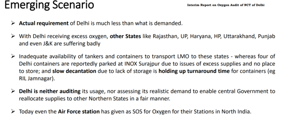 The interim report also highlighted at that time that Delhi was neither auditing its actual usage, nor assessing its realistic demand so as to allow the central government to reallocate to other states in Northern India that had actual need of LMO tankers in hospitals.