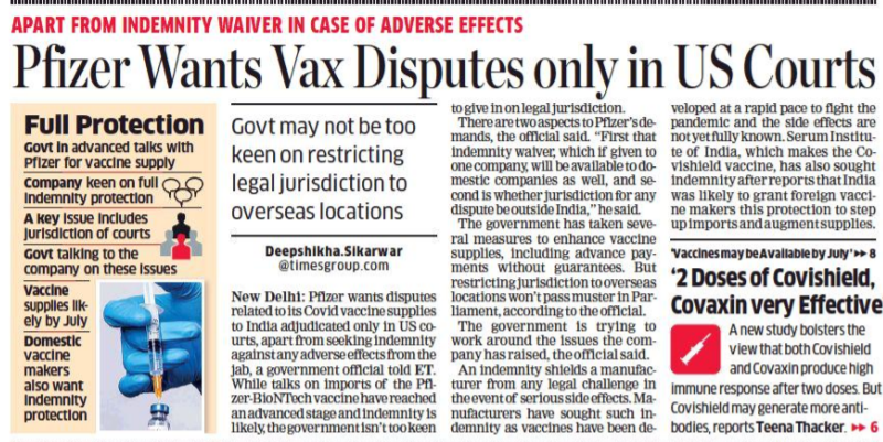 The talks between the vaccine manufacturer Pfizer and the Indian government have reached an advanced stage. ET reported that while the government might give in to the demand for ‘indemnity’, it would not relent on giving up its legal jurisdiction. A government official pointed out, “There are two aspects to Pfizer’s demands. First that indemnity waiver, which if given to one company, will be available to domestic companies as well, and second is whether jurisdiction for any dispute be outside India.”