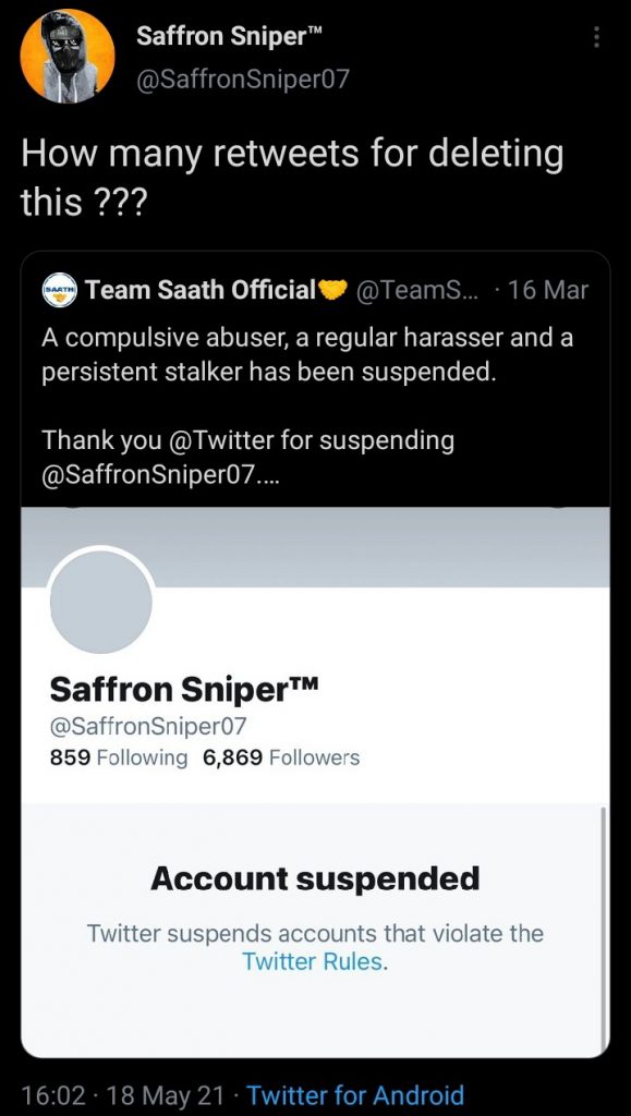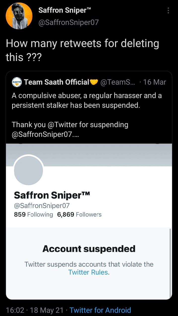 The account had earlier tried unsuccessfully to de-platform popular Twitter user named Saffron Sniper. In a tweet, Team Saath Official wrote, “A compulsive abuser, a regular harasser and a persistent stalker has been suspended.” However, when the Twitter account of Saffron Sniper was restored, the troll account was quick to delete the tweet.