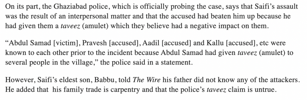 Moving on, The Wire then tries to dismiss claims that Abdul practiced occult and was involved in making and selling ‘tabeez’. The Police had said that the fight took place because Abdul’s customer of his occult-amulet was upset because it misfired. This is how The Wire has tried to dismiss claims: