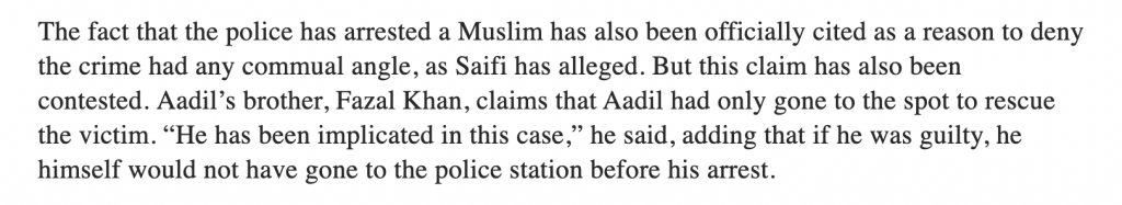 The Wire tried to insinuate that UP Police arrested one Muslim accused in the thrashing of elderly Muslim man to rule out communal angle. It cites Aadil’s brother Fazal Khan who claimed that Aadil had gone to ‘rescue’ Abdul and was falsely implicated.