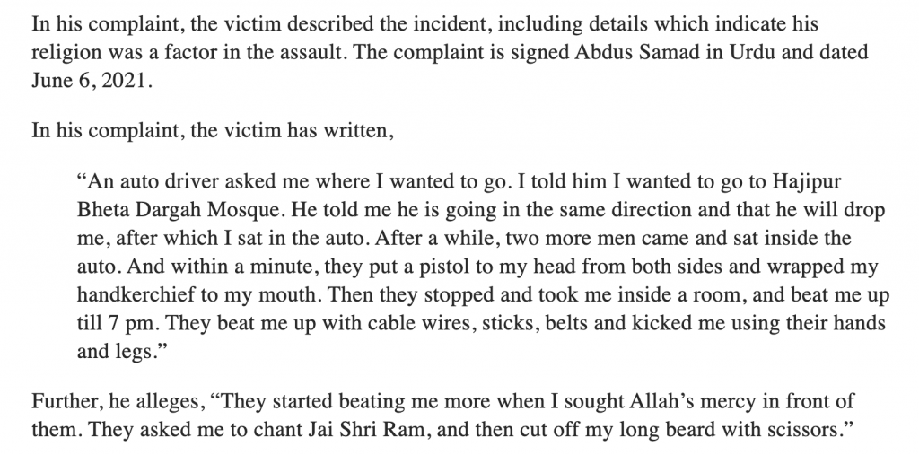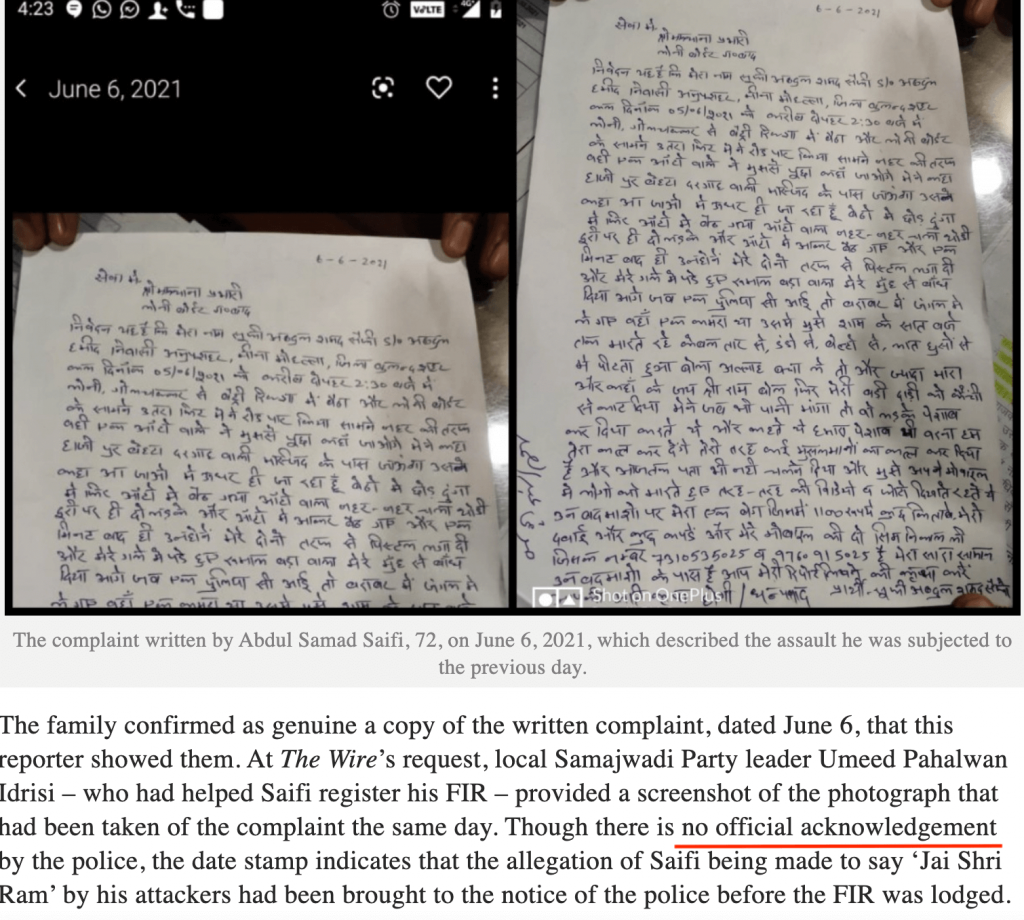 The Wire has shared an image of a ‘complaint’ which Abdul Samad Saifi, the occultist, allegedly submitted to police but was not included in the FIR. It claims that the complaint was ‘written’ by Abdul Samad Saifi on 6th June, 2021, a day after he was assaulted. In it, apparently, Saifi had claimed he was forced to chant ‘Jai Shri Ram’.