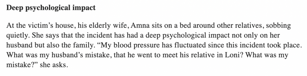 The Wire, to show the human-interest angle in occultist Abdul’s case, brought in his elderly wife. Describing her as sitting on a bed and crying, his elderly wife claimed that the incident where her husband was beaten up for making misfiring taveez has had ‘deep psychological impact’ on him and his family.