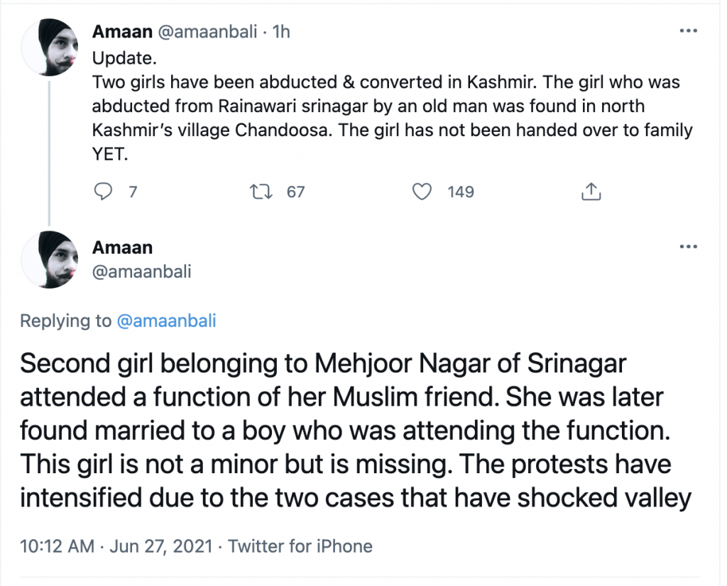 On June 26, a case of forced conversion came to light from Jammu & Kashmir. As per reports, an 18-year-old Sikh Girl from Badgam district was lured and forcefully converted to Islam. Shiromani Akali Dal leader Manjinder Singh Sirsa and Shiromani Gurdwara Parbandhak Committee (SGPC) have also raised the issue on social media platforms urging the Lieutenant Governor of Jammu and Kashmir to intervene.
