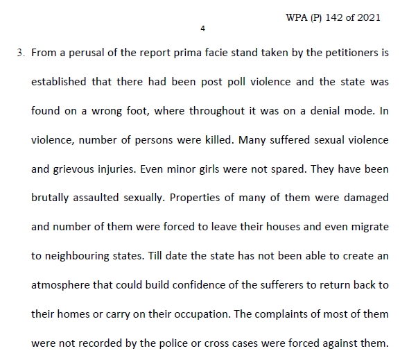 The High Court made a shocking observation that the West Bengal government has making false statements that there were no complaints about violence after the assembly elections, and those were figments of imagination of opposition parties. Contrary to the claim that nobody came forward with complaints about violence, when opportunity was given to people to file complaints with the State Legal Services Authority or the NHRC, the authorities were flooded with complaints.