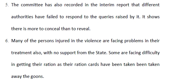 The HC order further adds that many of the persons injured in the violence are facing problems in their treatment, and they are not receiving any help or support from the state govt. Ration cards of many of the victims were taken away by the goons, and as a result, they are not being able to procured subsidised products from the public distribution system.
