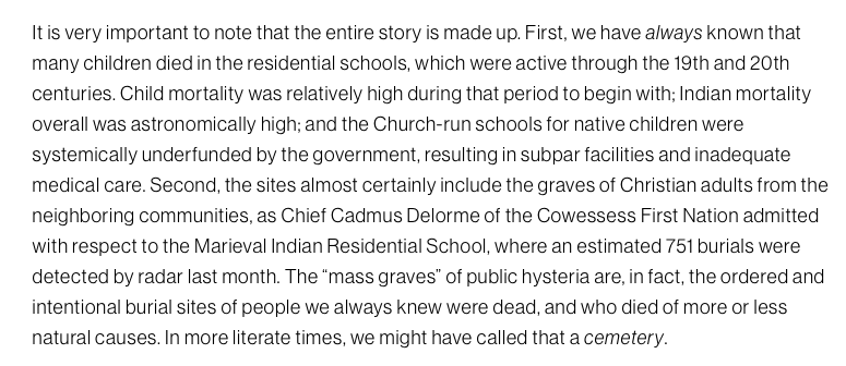 The article then declares the discovery of the mass burial sites and unmarked graves for those unnamed children from residential schools is “a made-up story”. It says that ‘many children died in residential schools because child mortality was quite high anyway in those days. Not just that, completely ignoring the fact that those children were forcibly taken away from their families and forced to stay in those residential schools, the article then blames the low funding by the government that caused substandard conditions in residential schools.