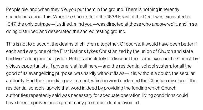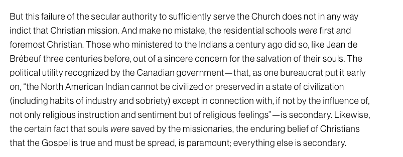 Further, the article goes on to defend the residential school system altogether. It actually asserts that ‘it was necessary to convert native people into Christianity because otherwise, “their souls could not have been saved” and the so-called “saving of the souls”, by converting the natives by any means, was the first and foremost duty of the Church and the government. Everything else was apparently secondary.