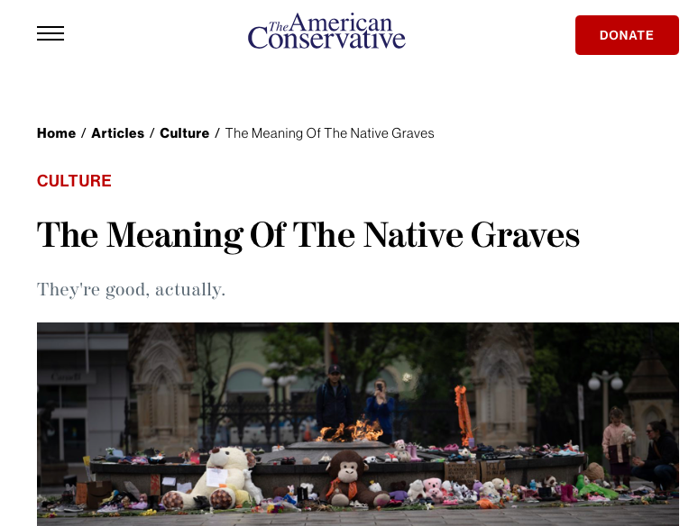 The article in American Conservative, published on July 8, titled “The Meaning of The Native Graves”, actually says the residential schools were dong ‘God’s work’. The article actually starts with paragraphs from The Bible, listing out lines where Jesus had apparently commanded to convert pagans and ‘save their souls’.