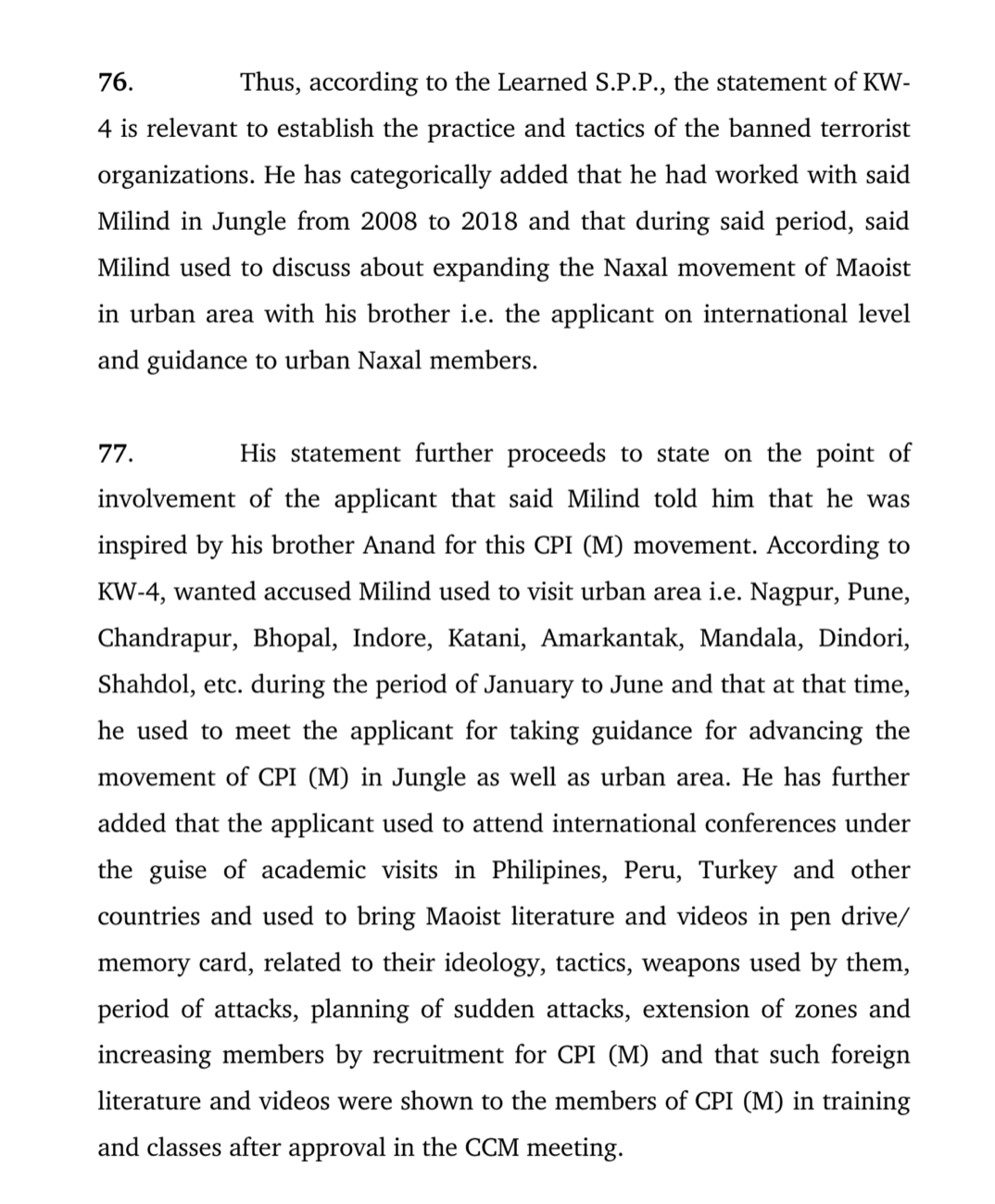 “…the applicant used to attend international conferences under the guise of academic visits in the Philippines, Peru, Turkey and other countries and used to bring Maoist literature and videos in pen drive/memory card, related to their ideology, tactics, weapons used by them, period of attacks, planning of sudden attacks, the extension of zones and increasing members of recruitment for CPI(M) and that such foreign literature and videos were shown to the members of CPI(M) in training and classes after approval in the CCM meeting,” the S.P.P contended.