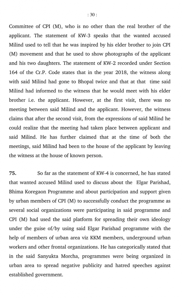 In his deposition, the key witness said Milind had reportedly confessed to him that he was inspired by his brother Anand for the CPI(M) movement. The witnesses revealed that Milind used to visit urban areas such as Nagpur, Pune, Chandrapur, Bhopal, Indore, Katani, Amarkantak, Mandala, Dindori, Shahdol, etc. and during that time, he used to meet applicant Anand Teltumbde for seeking his guidance on expanding the CPI(M) movement in the jungle as well as urban areas.