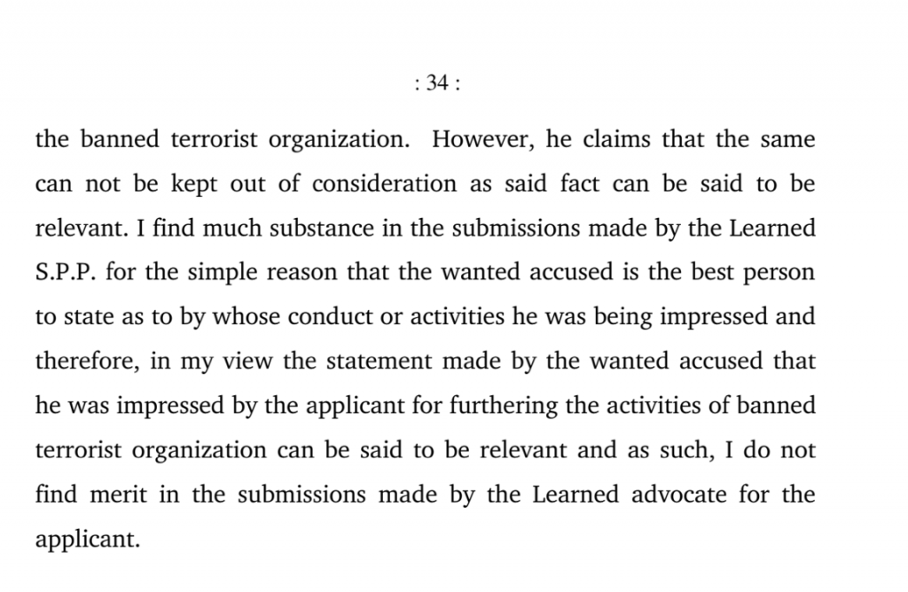 “I find much substance in the submissions made by the learned Special Public Prosecutor(S.P.P) for the smile reason that the wanted accused is the best person to state as to by who conduct or activities he was being impressed and therefore, in my view, the statement made by the wanted accused that he was impressed by the applicant for furthering the activities of a banned terrorist organisation can be said to be relevant…” read the court order announced by Justice Kothalikar while dismissing the bail application moved by Anand Teltumbde.