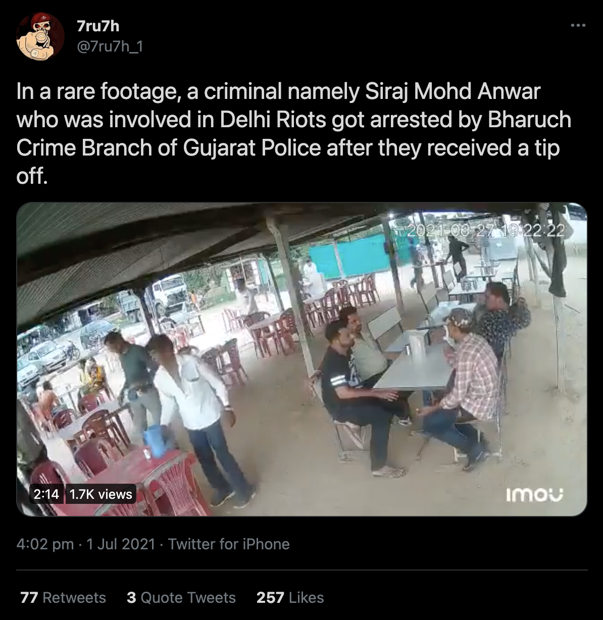Sharing the video of a covert operation that has gone viral on the internet, several social media users claimed that the Bharuch police had launched an operation to nab the Anti-Hindu Delhi riots’ accused Siraj Mohammed Anwar and his accomplice after they received a tip-off.