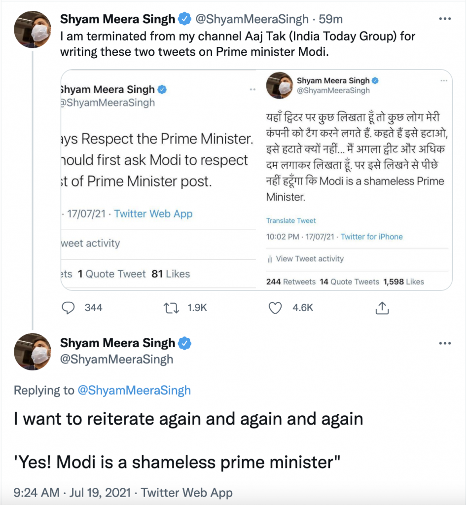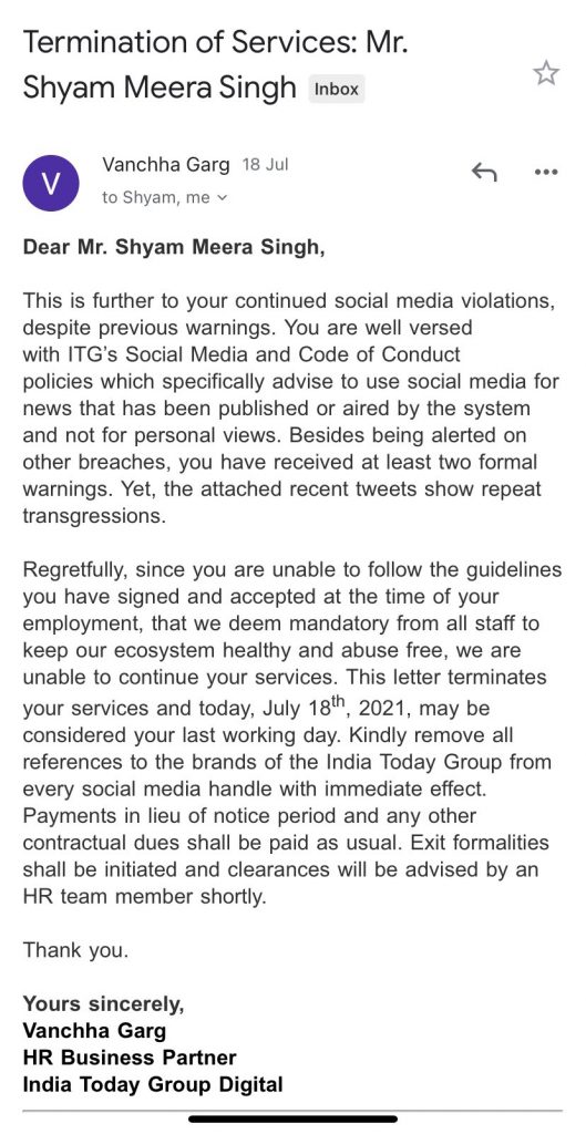 India Today employee, one Shyam Meera Singh on Monday took to Twitter to claim he was fired from his job over his tweets on PM Modi after the media house terminated his contract over violations of company’s guidelines on social media use.