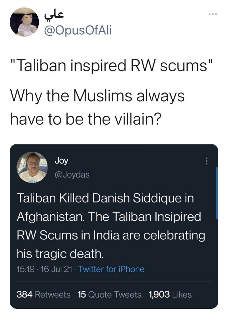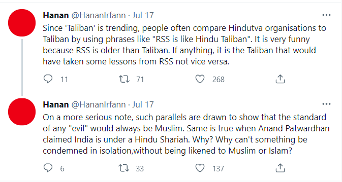 As evident from the above tweets, Islamists in India were angry at the liberal community for tarnishing the image of the terror outfit Taliban. By drawing a false equivalence between the timelines of RSS and Taliban and eliminating the role of the latter in the death of Danish Siddiqui, Islamists have tried to somehow portray the ‘right wing ecosystem’/ Sangh/ RSS as the ‘greater evil.’ Through bizarre analogies, and the subtle art of humanisation, Islamists have been able to help terror outfits get a new brand makeover of sorts.