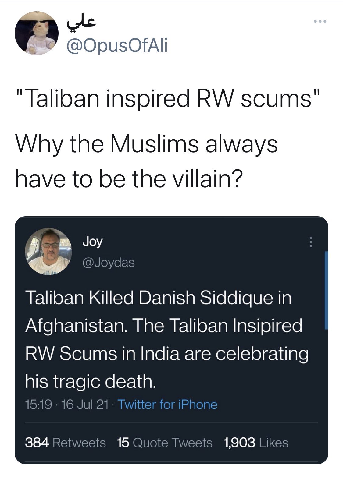 Such a frivolous comparison was however unacceptable to their Muslim counterparts. The Islamists felt aghast at the thought of liberals associating the Sangh with their ‘Ummah’ and ‘Taliban.’ Given that maligning the Taliban is blasphemous as per their beliefs, the Islamists took to Twitter to express their outrage. When ‘liberal’ Joydas alleged that Taliban inspired the ‘right-wing scums’, an aggrieved Islamist (@OpusOfAli) asked, “Why the Muslims always have to be the villian?”