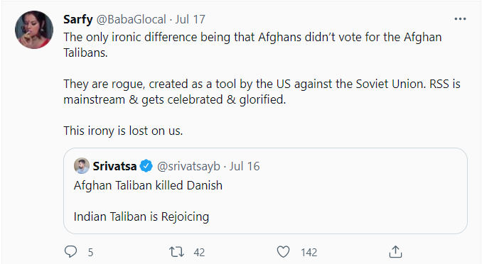 When Congress worker Srivatsa tried to earn liberal brownie points by likening Afghan Taliban to ‘Indian Taliban’, Islamic terror sympathiser Sarfy tweeted, “The only ironic difference being that Afghans didn’t vote for the Afghan Taliban. They are rogue, created as a tool by the US against the Soviet Union. RSS is mainstream & gets celebrated & glorified. This irony is lost on us.”